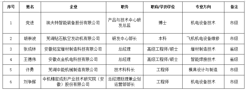 王德伟,硕士,芜湖点金机电科技有限公司首席技师,高级工程师,高级技师,安徽省产业教授,省级技能大师工作室带头人。主要从事新(异种)材料焊接、增材制造技术研发与产业化。主持完成激光熔覆强化顶头等8项重点研发项目。作为第一完成人取得国家授权发明专利8件、实用新型专利20多件;发表论文4篇,参编著作2本,参编行业标准1项;获得国家级精品开放课程1门、省教学成果奖2项。曾获安徽省技能大奖、安徽工匠、安徽省青年岗位能手、安徽省特别关注最美青工、芜湖市首席技师、芜湖市技术状元、芜湖市杰出青年岗位能手、芜湖市最美青工等荣誉称号。